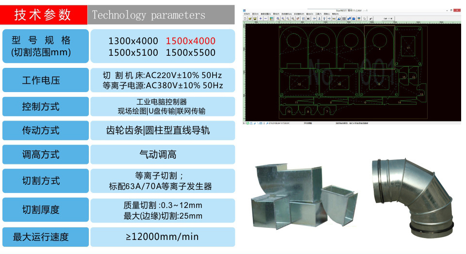 特別針對通風管道行業(yè)專門用于切割2mm以下的薄、中碳鋼板、 不銹鋼板、鋁板、銅板、鍍鋅板、白鐵皮、合金板等多種板材材料,快速風管等離子切割機,效果佳、無掛渣和毛刺;在使用時直接連接普通配置的臺式電腦,運用文泰軟件或AutoCAD繪圖軟件直接用于繪制圖形,不需轉(zhuǎn)換,直接切割,并可進行簡單的排料,工件共邊設(shè)置,購買本公司此款設(shè)備可享受免費送貨上門、安裝調(diào)試及培訓、包教包會!