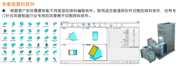 特別針對(duì)通風(fēng)管道行業(yè)專門用于切割2mm以下的薄、中碳鋼板、 不銹鋼板、鋁板、銅板、鍍鋅板、白鐵皮、合金板等多種板材材料,快速風(fēng)管激光切割機(jī),效果佳、無掛渣和毛刺;AutoCAD繪圖軟件直接用于繪制圖形,不需轉(zhuǎn)換,直接切割,并可進(jìn)行簡(jiǎn)單的排料,工件共邊設(shè)置,購(gòu)買本公司此款設(shè)備可享受免費(fèi)送貨上門、安裝調(diào)試及培訓(xùn)、包教包會(huì)!